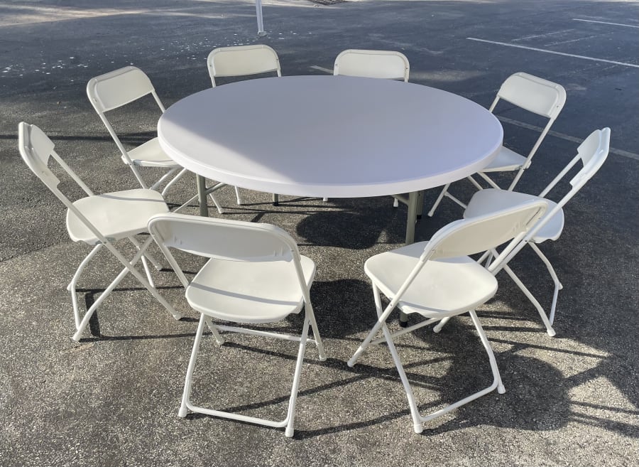 🎉 Looking for the perfect table to complement your special event? Our 5ft Round White Table is your ultimate choice, seamlessly merging style and functionality. Whether you're hosting a wedding, backyard party, or a private function, this versatile table is designed to suit any occasion with grace and elegance.