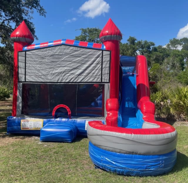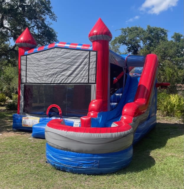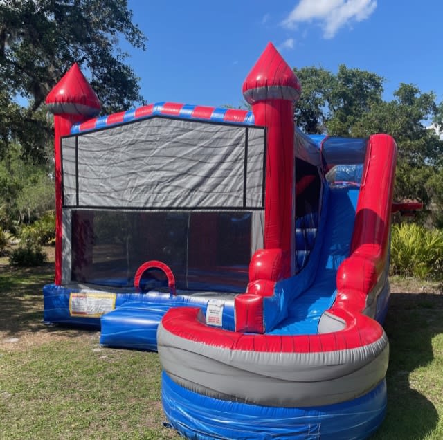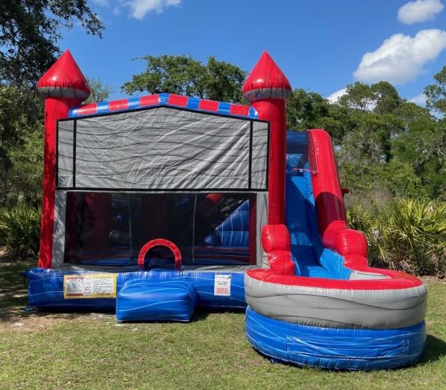 Sport Castle Combo is sure to be a hit at your next party! Equipped with a bounce house, two basketball hoops (one inside and one outside), obstacle course and of course a slide. Add water and you're all set for hours of fun. Offered wet or dry.