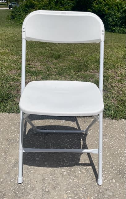 Let us bring tables and chairs for your next party. These heavy duty white plastic folding chairs are a perfect addition for your next gathering.