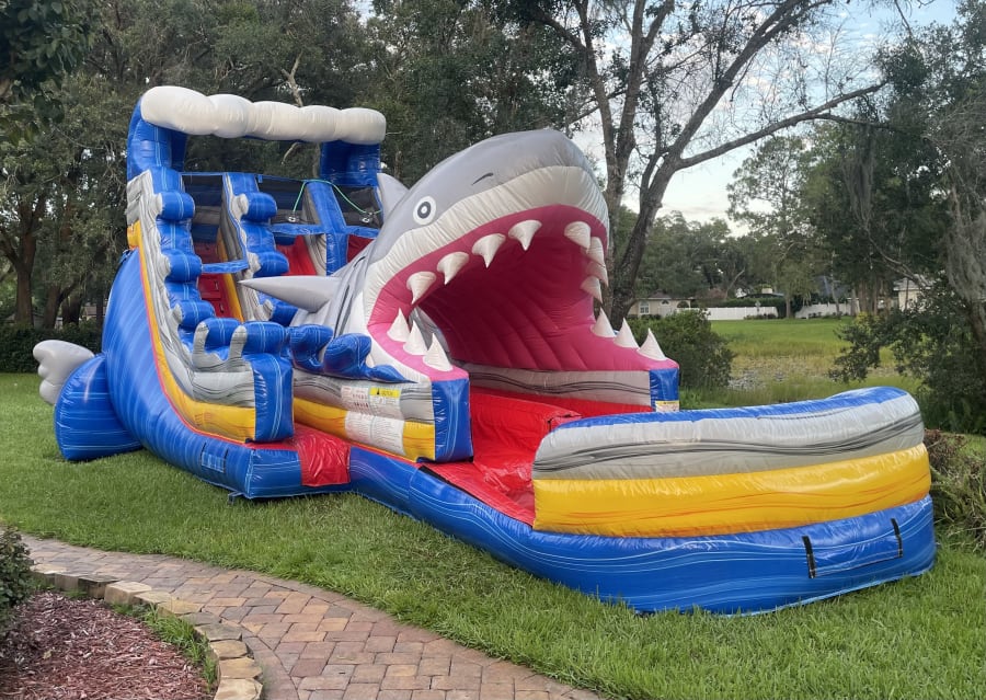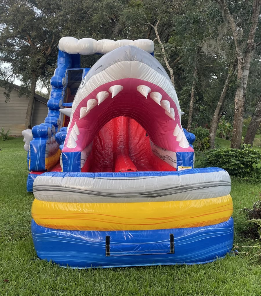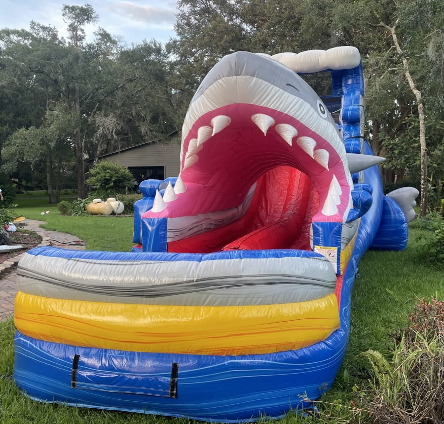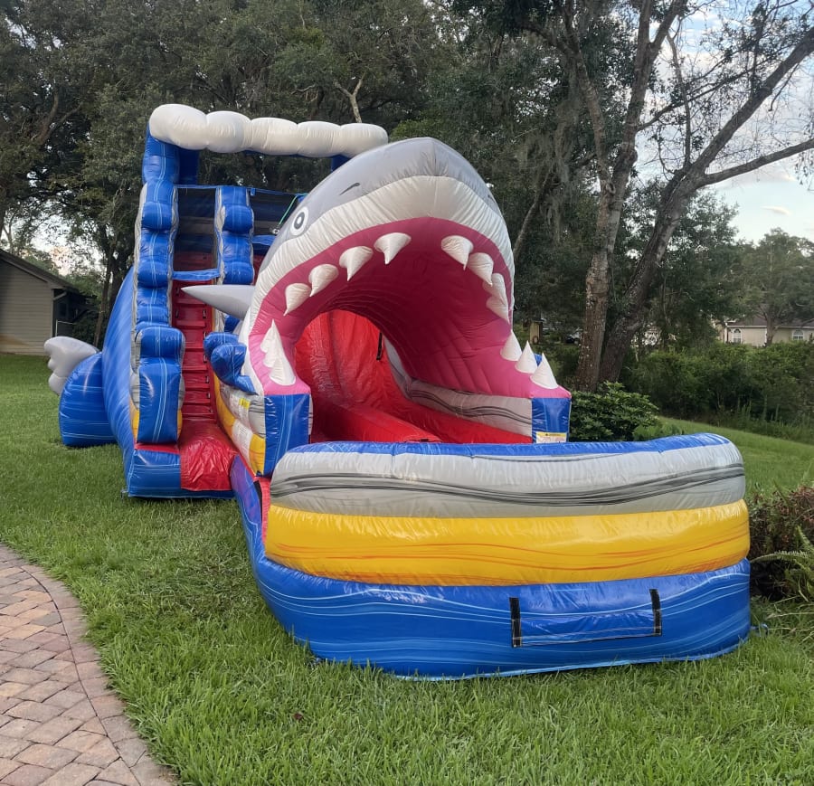 The Shark Attack 18ft Dual Lane Extended Slide is sure to make your event fun for kids and adults alike. The shark tunnel adds a unique waterslide experience for your guests and more shade protection from the Florida sun.